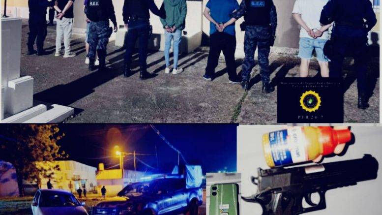 En esos instantes, los uniformados visualizan en cercanías el vehículo interesado, generándose un seguimiento, donde al querer interceptarlo en inmediaciones de Calles San Martín y Díaz Vélez de esta localidad, el conductor con el afán de querer evadir las patrulla colisiona con la parte frontal lateral izquierdo de uno de los móviles policiales finalizando allí su recorrido. Al anoticiar a la Unidad Fiscal de Turno, ordenó la aprehensión de los cinco masculinos mayores de edad que se trasladaban en el rodado en cuestión y su traslado a sede policial para permanecer alojados a su disposición, como a su vez el Secuestro del aparato telefónico que se encontraba en poder del llamante.