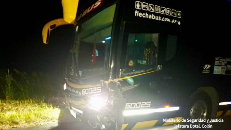 Por causas que se tratan de establecer, un colectivo de larga distancia que circulaba en sentido sur a norte transportando 57 pasajeros, colisionó con un semoviente que se encontraba sobre la calzada.
